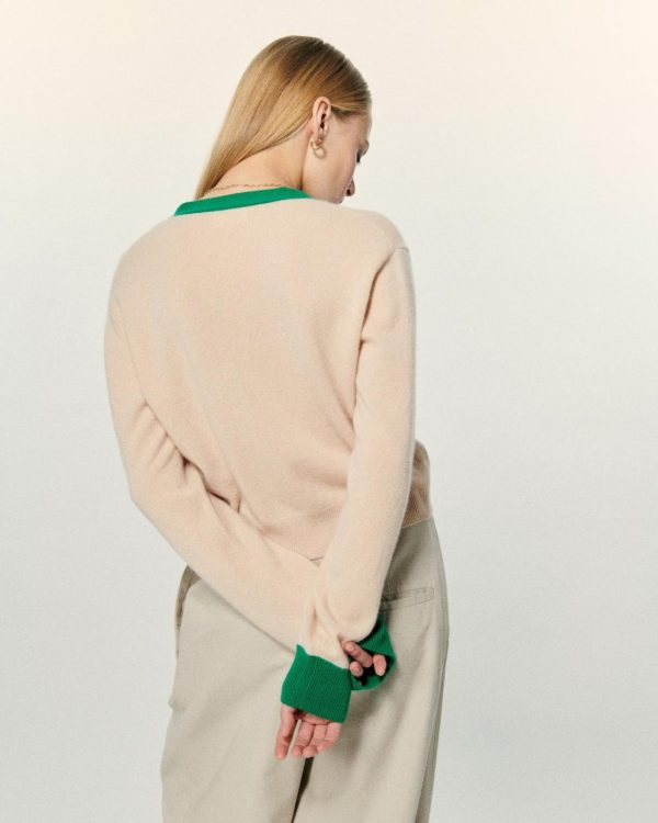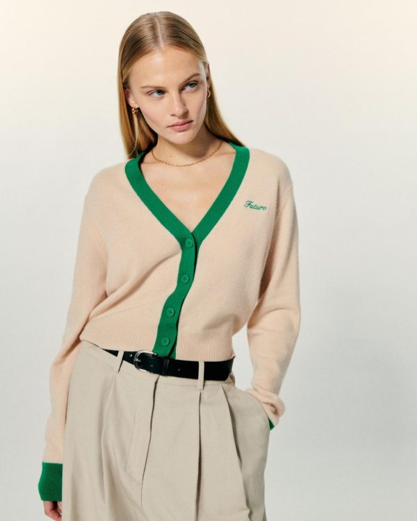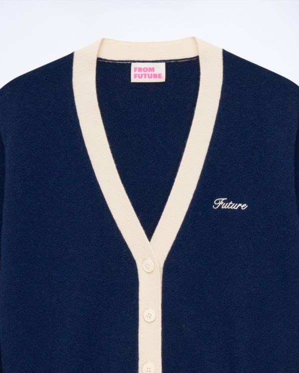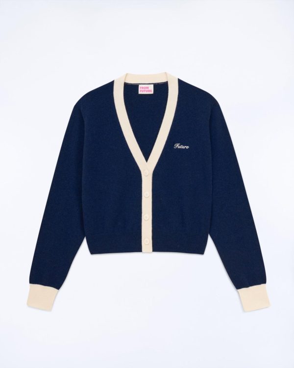 Inspiration collège et élégance intemporelle pour ce pull cardigan court bicolore, confectionné en cachemire 2 fils. Muni de manches longues et de bords côtelés, il arbore une signature brodée « Future » à la poitrine et des bandes contrastées le long du col V et de la fermeture boutonnée. Rejoignez le Club !