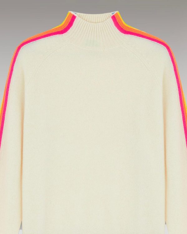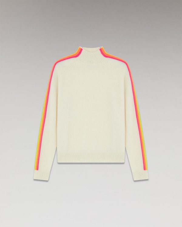 Douceur et légèreté pour ce pull court confectionné en cachemire 2 fils qui capture l’essence du style futuriste. Muni d’un col montant et de bords côtelés, il se twiste de bandes aux couleurs vibrantes le long des manches. Idéal pour structurer la silhouette avec audace, mixez-le à un jean casual ou une jupe fluide.
