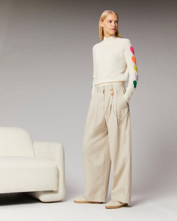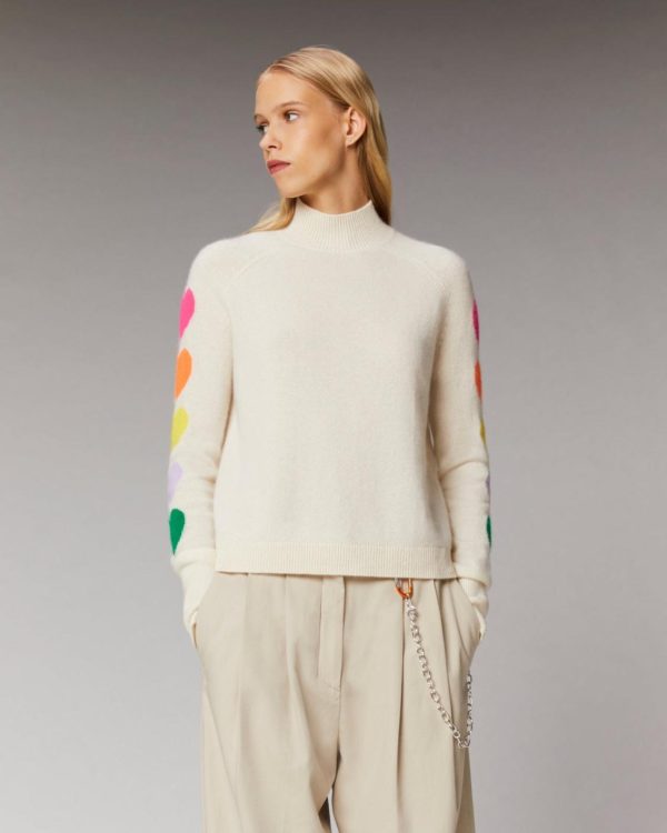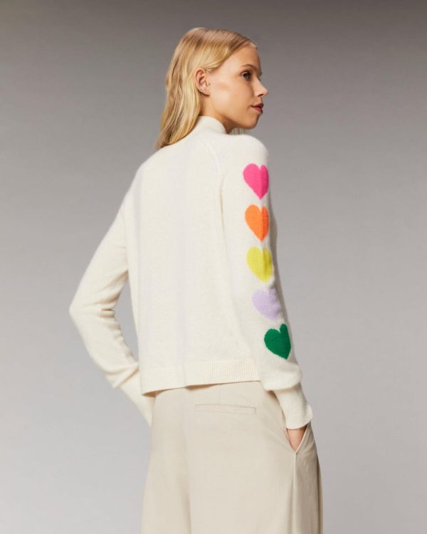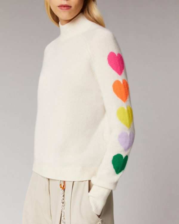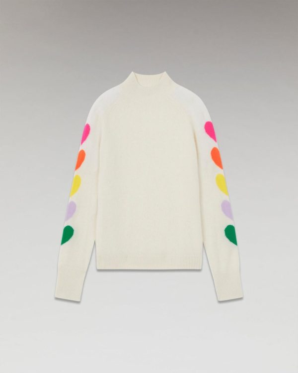 Léger et infiniment doux, ce pull court confectionné en 100% cachemire 2 fils est une véritable déclaration cosmique. Constellé de cœurs multicolores le long des manches, il dévoile un col montant et des bords côtelés. Idéal pour réchauffer votre allure avec audace et style, il s’associe à un jean décontracté pour un look élégant et futuriste.