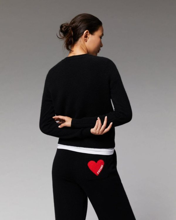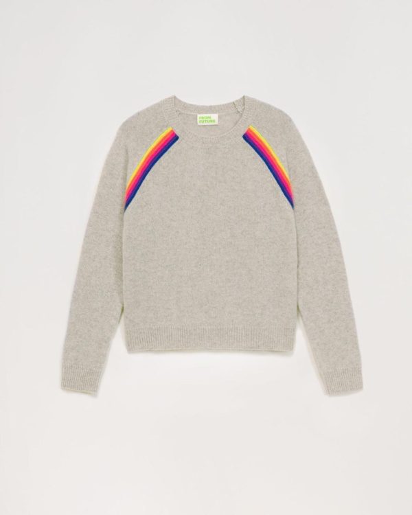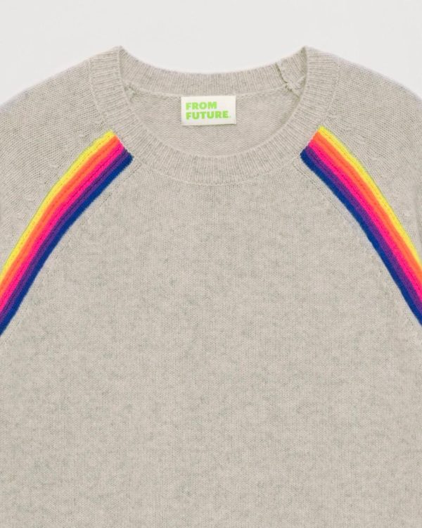 Pull col rond à bande multicolore en cachermire 4 fils. Manches raglan (c’est à dire, légèrement tombantes), motif « arc-en-ciel » an jacquard et coupe boxy – le classique, pas si classique, qui viendra réveiller un look casual jean/baskets d’une pointe de fun.