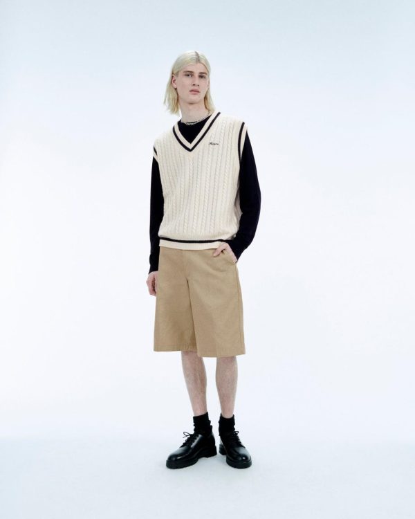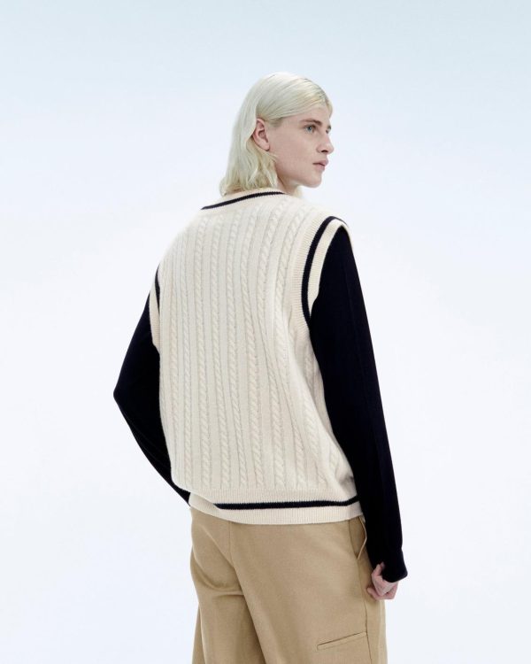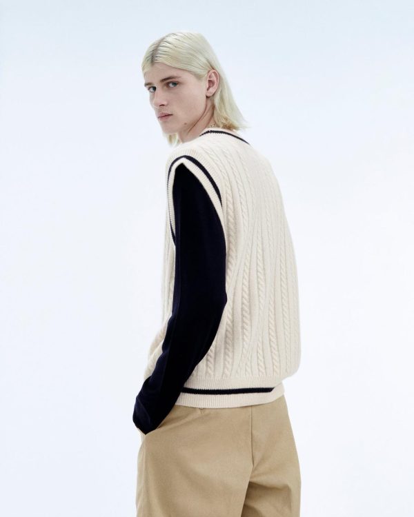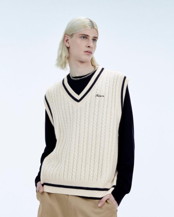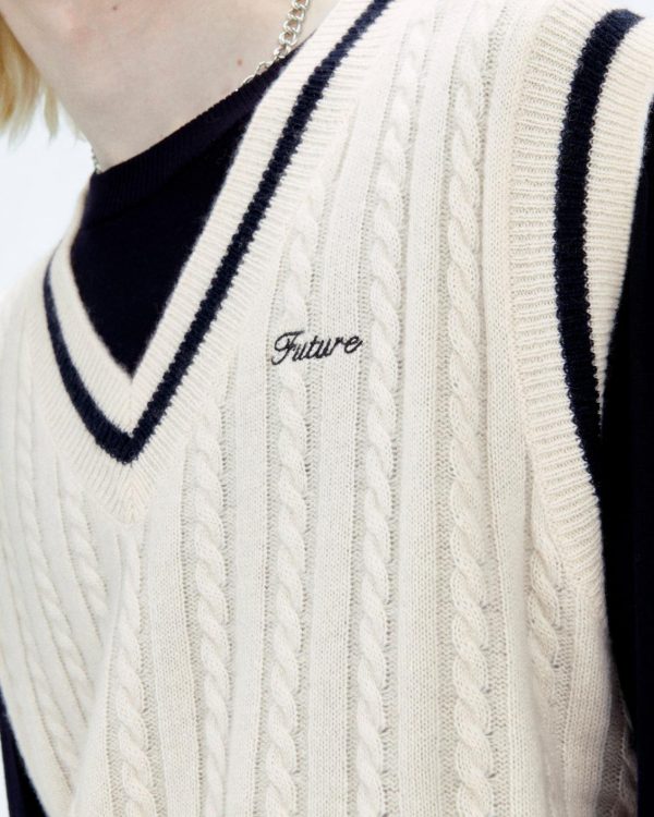Élégance cosmique et lignes futuristes pour ce pull sans manches confectionné en cachemire 4 fils. Idéal pour structurer votre silhouette, il affiche un col polo, une broderie « Future » à la poitrine et des bords côtelés contrastés.