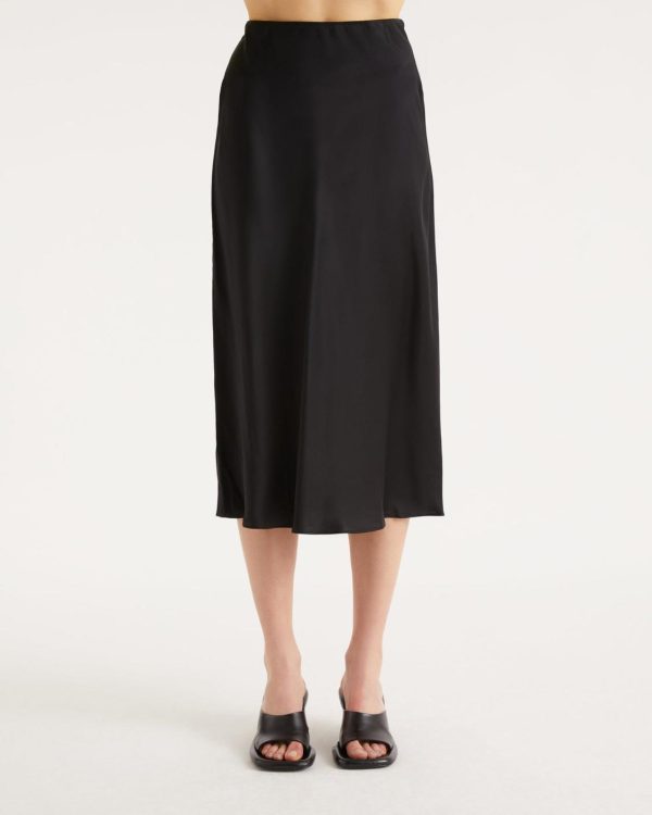 La jupe Gina mi-longue en satin de soie brillant et soyeux s’adopte de jour comme de nuit, avec un caraco léger comme une maille moelleuse. D’une élégance cosmique, elle dévoile une taille élastiquée et un drapé fluide évasé.