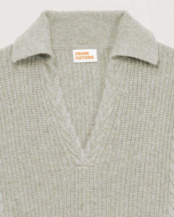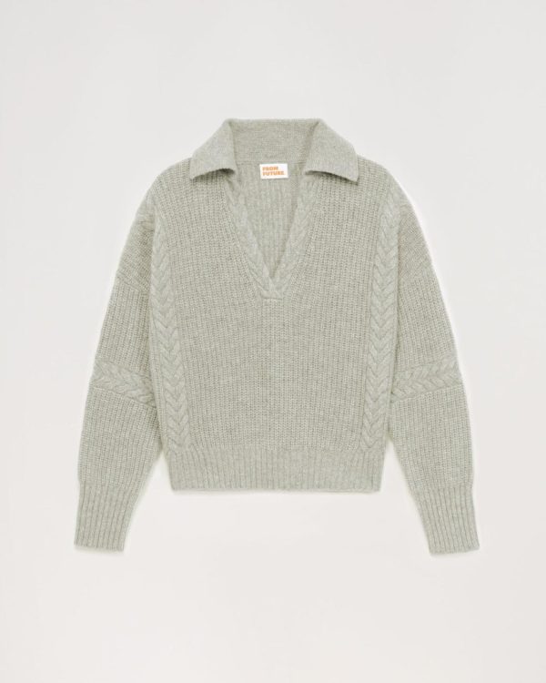 FROM FUTURE Pulls En Cachemire | Pull Col Polo Torsades Gris Chiné Foncé Femme