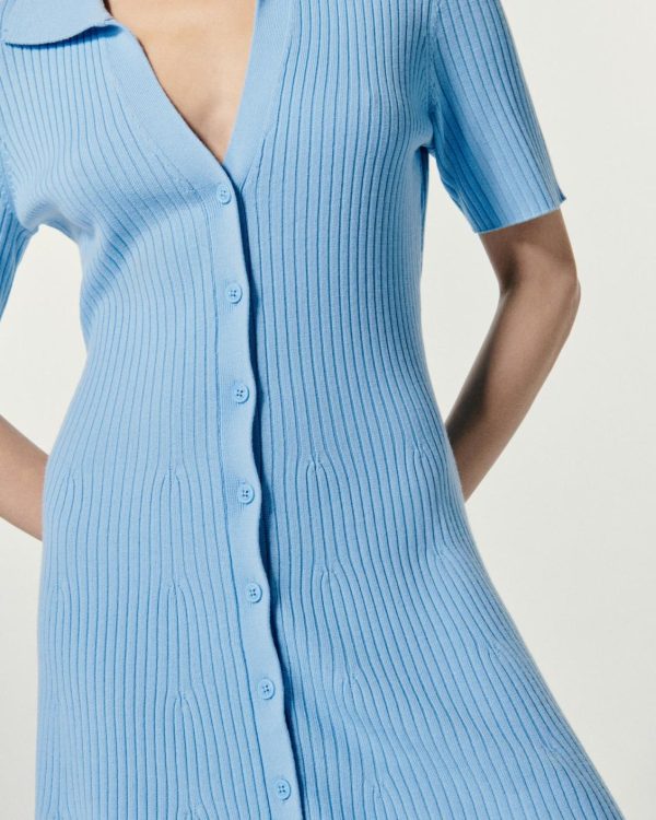 Une maille lumineuse et côtelée s’invite sur cette robe courte confectionnée en laine mérinos. Munie d’un col chemise et de manches courtes, elle dévoile un décolleté en V et une fermeture boutonnée. Incarnant l’élégance futuriste, elle confère une silhouette ajustée, sublimée d’une jupe évasée. À porter seule ou sur une veste structurée, complétez votre look avec une paire de sneakers ou d’escarpins.