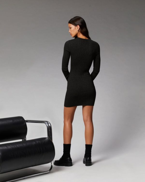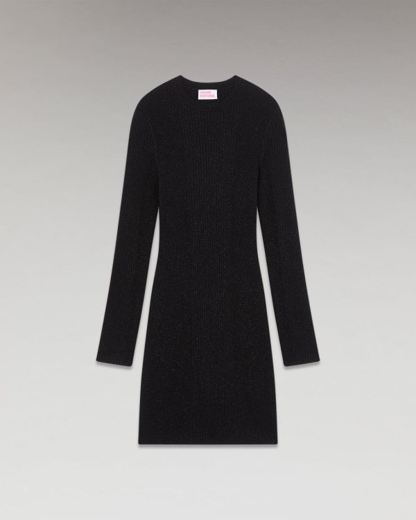 L’indispensable robe courte du vestiaire féminin est revisitée dans une version ajustée en maille côtelée et métallisée. En laine mérinos certifiée RWS (Responsible Wool Standard) et en lurex, elle dévoile un col rond et des manches longues.